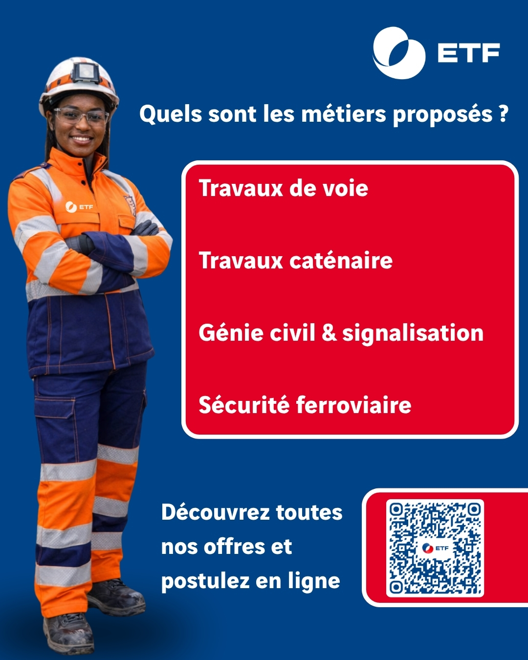 ETF offre un large éventail d’alternances couvrant les principales disciplines liées aux travaux ferroviaires, accessibles à différents niveaux d’études (CAP, Bac Pro, BTS, BUT, Licence Pro, écoles d’ingénieurs, Masters).