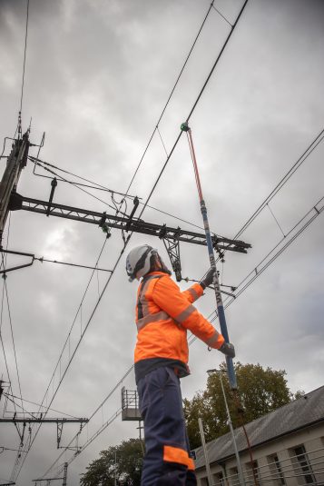 En parallèle nos experts en caténaires ont assuré la protection électrique du chantier, notamment par des opérations de perchage, indispensables à la sécurité des équipes intervenant sur les voies.